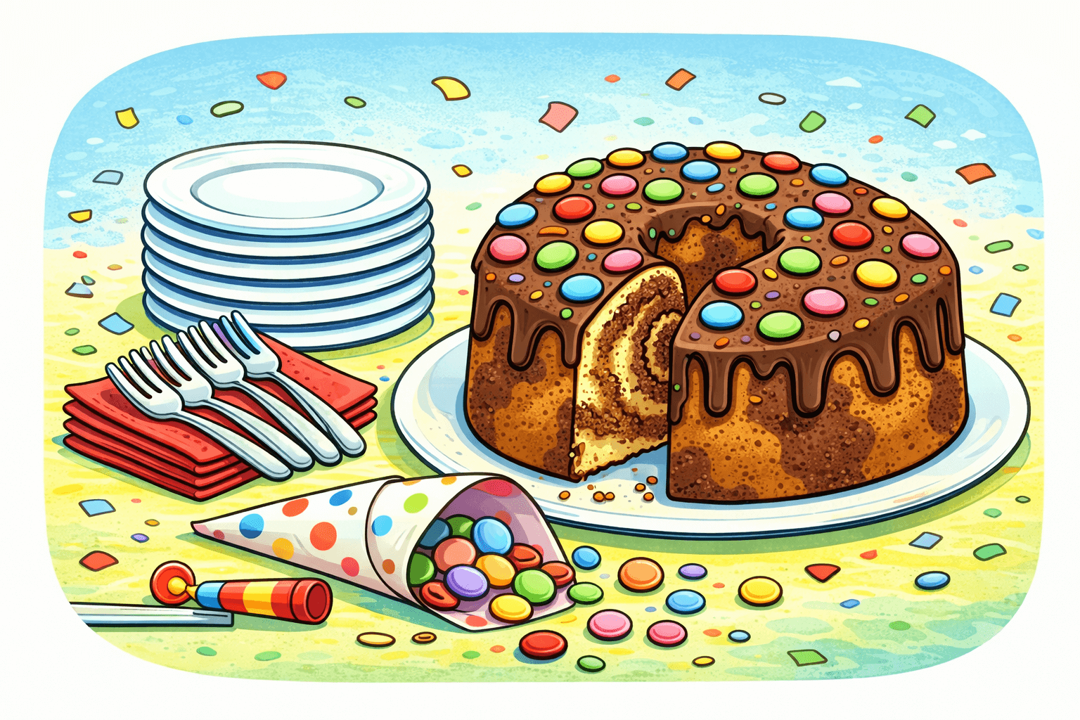Smarties Party Cake, Marmorkuchen mit Schokoüberzug und Smarties, 18cm, 12 Stücke - dazu Teller, Servietten und Gabeln